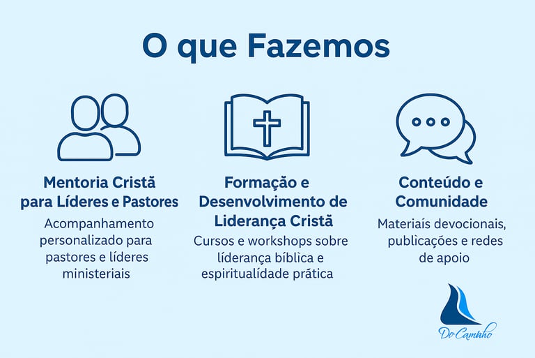 Na Do Caminho, atuamos com foco na formação integral de líderes cristãos, conectando princípios bíblicos, sabedoria prática e ferramentas contemporâneas para fortalecer o ministério, a vocação e a saúde emocional de quem lidera.